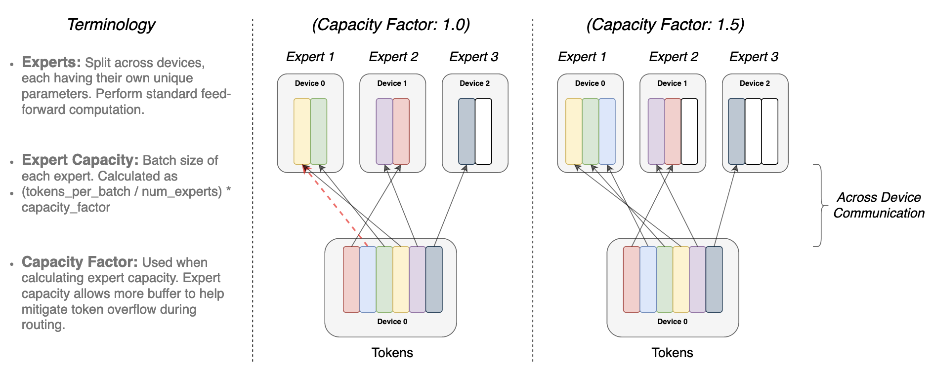 容量因子设置得越大,每个专家就能处理更多的 token。如果容量因子太大,则会浪费计算资源。相反,如果容量因子太小,则 Token 溢出会导致模型性能下降。
