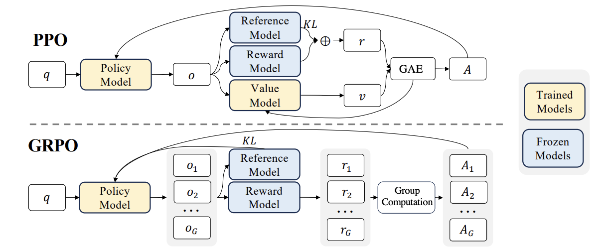 GRPO 仅需策略模型、参考模型和奖励模型(共3个),资源消耗更低。